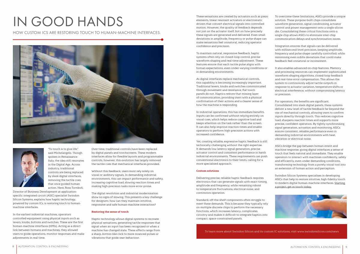 “ To touch is to give life,” said Michelangelo. Though spoken in Renaissance Italy, the idea still resonates in the Digital Age. Across industry, traditional controls are being replaced by sleek digital interfaces, removing the tactile cues that once guided human action. Here, Ross Turnbull, Director of Business Development at applicationspecific integrated circuit( ASIC) specialist Swindon Silicon Systems, explains how haptic technology, powered by custom ICs, is restoring touch to humanmachine interfaces.
