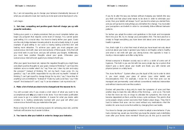 Setting your goals is a simple procedure that you must complete before you begin any program that requires some level of change. You cannot ignore goal-setting. It is a crucial step. You have to clearly define your goals. Goals are the only bridge between knowing what to do and actually doing it. A good example of goal-setting in our case is having lasting acne-free skin and looking more attractive. To achieve your goals you must program your subconscious mind with clear and vivid pictures of these goals. Only then will your mind work in your favor, and you will achieve your targets. Additionally, you must have positive thoughts about your goals. Otherwise your subconscious mind will work against you instead of with you.