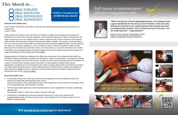 Today ' s practice of dentistry at the interface with medicine is complex. With varying levels of evidence of effectiveness of many of our preventive, diagnostic, and therapeutic approaches to disease management and health maintenance, we must, together with our patients, weigh the risks of harm compared to the expected health benefits of all care options using the best medical evidence available. This practice environment places the onus on the provider to stay abreast of scientific discoveries and acknowledge that there may not always be one“ best way” to prevent, diagnose, or treat a condition in order to improve the patient ' s health and wellbeing. Reports of clinical trials, systematic reviews, and meta-analyses in our journal contribute to our readers ' knowledge of the changing landscape of patient management across the multiple specialties that support Oral Surgery Oral Medicine Oral Pathology and Oral Radiology.
