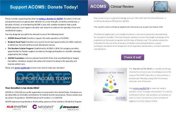ACOMS Foundation: A donor advised fund( DAF) of the Oral and Maxillofacial Surgery Foundation. Donations support education and research to advance the specialty and improve patient care.