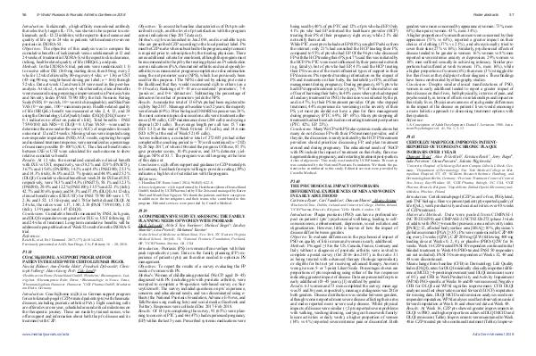 Introduction: Plaque psoriasis( PSO) can have a profound impact on patients’( pts’) psychosocial wellbeing, leading to selfconsciousness, embarrassment, depression, social isolation and stigmatization. However, little is known of how the impact of disease differs between genders. Objective: To evaluate differences in the psychosocial impact of PSO on quality of life in men and women in early adulthood. Methods: Pts aged ≥18 in the US, Canada, France, Germany and Italy without a diagnosis of psoriatic arthritis were invited to complete a postal survey( Oct 2016 – Jan 2017), in the ratio 3:1 as being treated with advanced therapy( biologic / apremilast), or eligible for but not yet receiving advanced therapy. Answers were given on 5- or 7-point Likert Scale. Percentages shown are proportions of pts responding using either of the two responses indicating greatest impact of disease. Data are presented for pts in early adulthood( 18 – 45 years),[ 1 ] stratified by gender. Results: 63 women and 73 men completed the survey; mean age was 35 and 36 years, respectively, mean age at diagnosis was 28 for both genders. Disease distribution was similar between genders, although women reported more severe disease affecting their arms and males reported more severe scalp disease. Whilst physical impacts of disease were similar( ≤ 2 pts reported severe problems with walking, washing / dressing, carrying out housework / family / leisure activities or daily work), a higher proportion of women( 14 % vs 4 %) reported severe / extreme pain or discomfort. Both genders were more concerned by appearance( women: 73 %, men: 63 %) than pain( women: 43 %, men: 34 %). A higher proportion of women than men were concerned by their appearance( 73 % vs 63 %), reported a greater impact on their choice of clothing( 37 % vs 21 %), and always / usually tried to cover their skin( 27 % vs 16 %). Similarly, psychosocial effects of disease tended to be greater in women: 16 % women vs 8 % men reported severe / extreme anxiety or depression; 29 % women vs 18 % men suffered sexually / in achieving intimacy. Similar proportions had suffered at work( women: 11 %, men: 16 %), while a higher proportion of women( 6 %) than men( 3 %) struggled to live their lives as they did prior to their diagnosis. These findings have been corroborated by ethnography studies. Conclusion: Despite similar clinical manifestations of PSO, women in early adulthood tended to report a greater impact of their disease on their lives, both physically, in terms of pain, and psychosocially, in terms of effects on relationships and impact on their daily lives. Physician awareness of such gender differences in the impact of the disease on patients’ lives would encourage a more holistic approach to discussing treatment options with their patients. Reference: 1. A Conception of Adult Development. Daniel J. Levinson. 1986. American Psychologist vol. 41, No. 1, 3-13