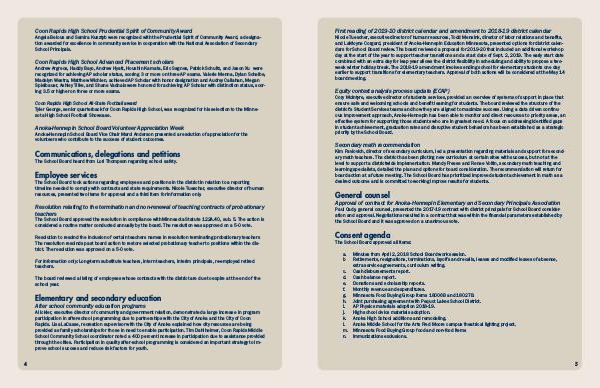 Nicole Tuescher, executive director of human resources, Todd Mensink, director of labor relations and benefits, and LaMoyne Corgard, president of Anoka-Hennepin Education Minnesota, presented options for district calendars for School Board review. The board reviewed a proposal for 2019-20 that included an additional workshop day at the start of the year to support teacher transitions and a start date of Sept. 2, 2019. The early start date combined with an extra day for leap year allows the district flexibility in scheduling and ability to propose a twoweek winter holiday break. The 2018-19 amendment involves ending school for elementary students one day earlier to support transitions for elementary teachers. Approval of both actions will be considered at the May 14 board meeting.