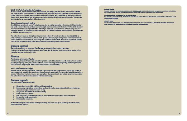 Next meeting: Regular School Board meeting on Monday, May 22 at 6:30 p. m., Sandburg Education Center, 1902 Second Ave., Anoka.