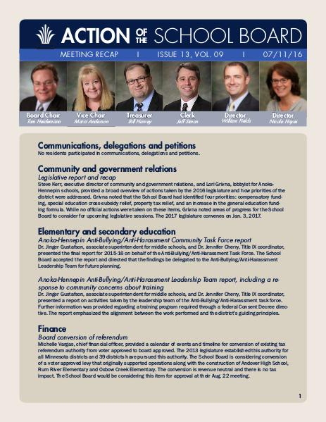 Steve Kerr, executive director of community and government relations, and Lori Grivna, lobbyist for AnokaHennepin schools, provided a broad overview of actions taken by the 2016 legislature and how priorities of the