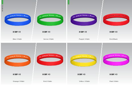 Wristbands MSRP: $3 Blue/White MSRP: $3 Orange/White MSRP: $3 Green/White MSRP: $3 Red/White MSRP: $3 MSRP: $3 Purple/White Red/Black MSRP: $3 Yellow/White MSRP: $3 Pink/White
