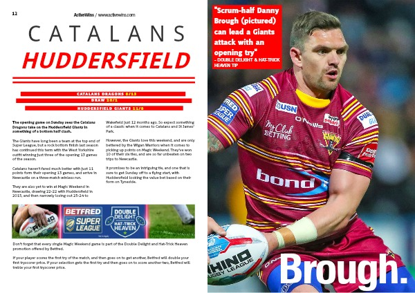 The opening game on Sunday sees the Catalans Dragons take on the Huddersfield Giants in something of a bottom half clash.