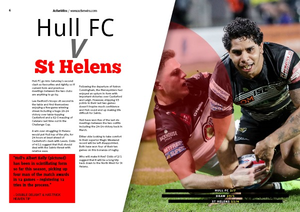 A win over struggling St Helens would put Hull top of the pile, for 24 hours at least ahead of Castleford’s clash with Leeds. Odds of 4/11 suggest that Hull should deal with the Saints threat with relative ease.