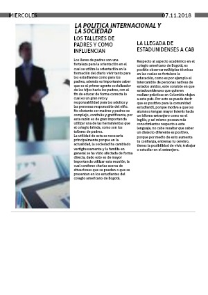 Respecto al aspecto académico en el colegio americano de Bogotá, es posible observar múltiples técnicas en las cuales se fortalece la educación, como es por ejemplo el intercambio de personas nativas de estados unidos, este consiste en que estadounidenses que quieren realizar prácticas en Colombia viajan a este país. Por esto se puede decir que es positivo para la comunidad estudiantil, porque motiva a que los alumnos tengan mayor interés hacia un idioma extranjero como es el inglés, y así mismo posean más conocimientos respecto a este lenguaje, no cabe resaltar que saber un dialecto diferente es positivo, porque por medio de esto aumenta tu confianza, entrenas tu cerebro, tienes la posibilidad de vivir, trabajar o estudiar en el extranjero.