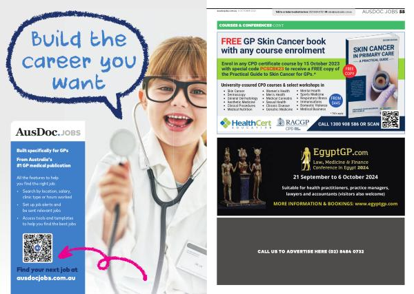 Talk to us today to advertise here : ( 02 ) 8484 0732 OR sales @ ausdocjobs . com . au AUSDOC . JOBS 55