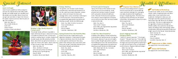 Learn how to paddle correctly and get in and out of a kayak easily and safely. Both double and single kayaks are available and life jackets are provided. Wear shoes that can get wet and dress in layers for time on the water. Youth must be at least 6 years of age. Kerri Kolstad Date: Sat, May 13 Time: 9:00 – 10:30 am Cost: $ 19 Class #: AER2 Location: Silver Lake Beach