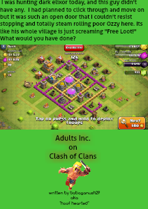 I was hunting dark elixor today, and this guy didn't have any. I had planned to click through and move on but it was such an open door that I couldn't resist stopping and totally steam rolling poor Ozzy here. Its like his whole village is just screaming "Free Loot!" What would you have done?