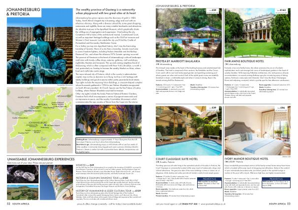 FREE transfers : To / from Blue Train or Rovos Rail station , or from OR Tambo Airport ( JNB ). visit your travel agent or call 08444 937 444 • www . premierholidays . co . uk SOUTH AFRICA 53