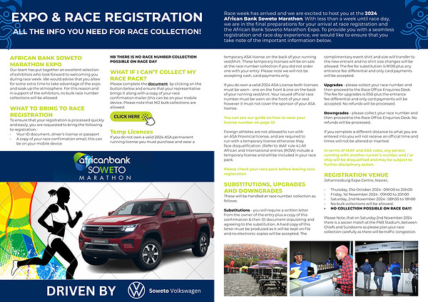 Race week has arrived and we are excited to host you at the 2024 African Bank Soweto Marathon . With less than a week until race day , we are in the final preparations for your arrival at race registration and the African Bank Soweto Marathon Expo . To provide you with a seamless registration and race day experience , we would like to ensure that you take note of the important information below .