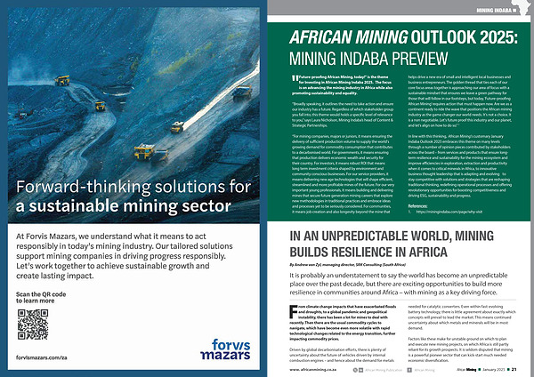 In line with this thinking , African Mining ’ s customary January Indaba Outlook 2025 embraces this theme on many levels through a number of opinion pieces contributed by stakeholders across the board – from services and products that ensure longterm resilience and sustainability for the mining ecosystem and improve efficiencies in exploration , extraction and productivity when it comes to critical minerals in Africa , to innovative business thought leadership that is adapting and evolving to stay competitive with solutions and strategies that are reshaping traditional thinking , redefining operational processes and offering revolutionary opportunities for boosting competitiveness and driving ESG , sustainability and progress .