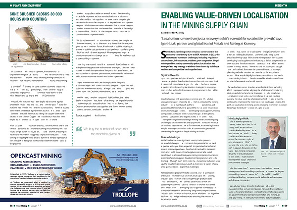 Significant benefits Igor Hulak , partner and global lead of Metals and Mining at Kearney , explains , “ Localisation is more than just a recovery tool ; it ' s essential for sustainable growth .” Hulak , who has extensive experience implementing localisation strategies in emerging markets , has led multiple successful programmes in the Middle East and Africa region .