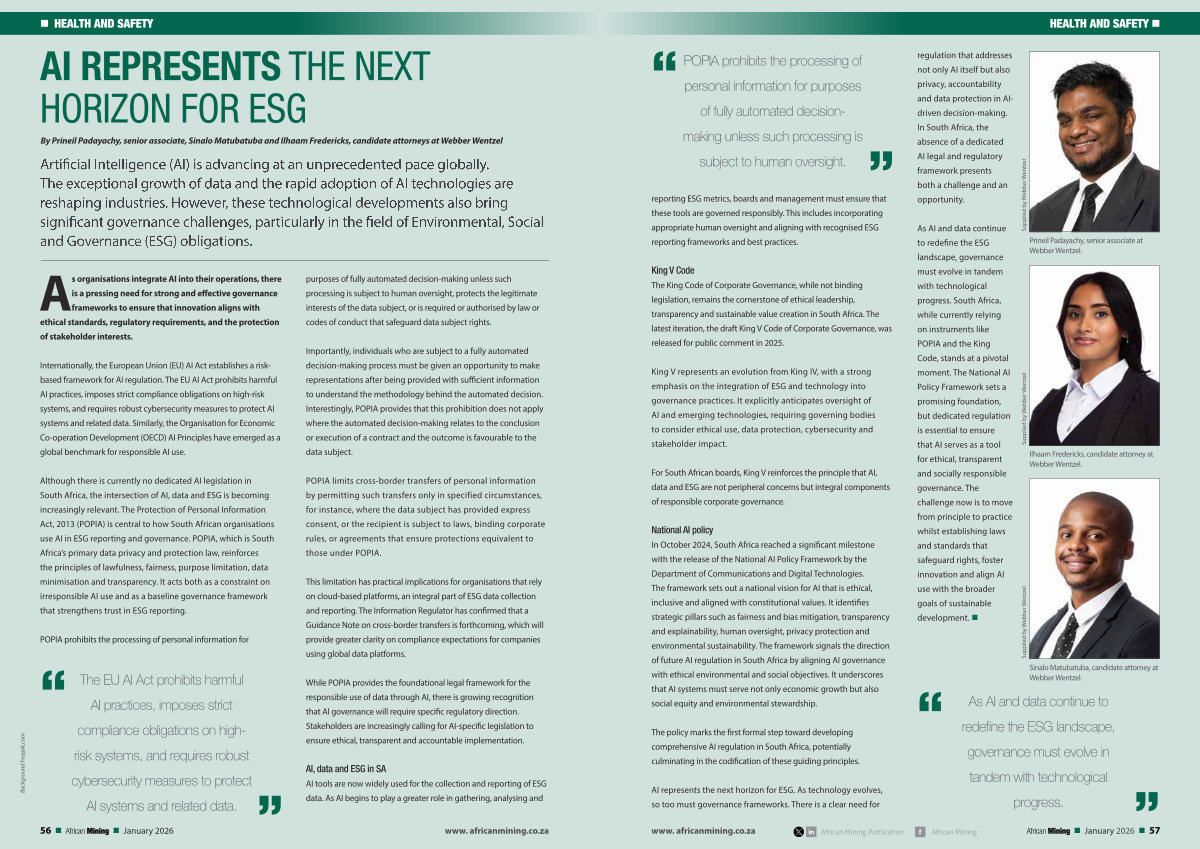 As AI and data continue to redefine the ESG landscape, governance must evolve in tandem with technological progress. www. africanmining. co. za African Mining Publication African Mining African Mining • January 2026 • 57