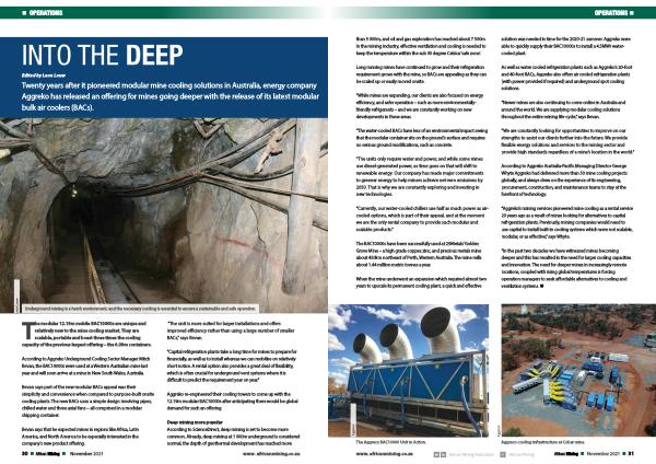 Twenty years after it pioneered modular mine cooling solutions in Australia , energy company Aggreko has released an offering for mines going deeper with the release of its latest modular bulk air coolers ( BACs ).