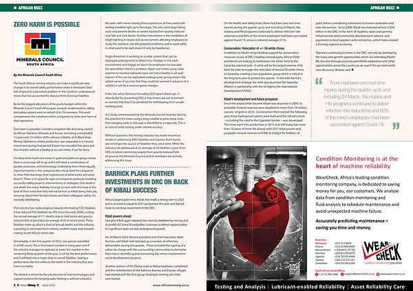 4 • African Mining • June 2022 life saver , with mines sharing their experiences of lives saved with netting installed right up to the stope . The nets catch large falling rocks and prevent deaths or severe injuries from gravity-induced rock falls and rock bursts . Another intervention is the installation of bright lighting in stopes and access tunnels , allowing employees to study the rock face , identify potential problems , and to work safely in what used to be dark places lit only by headlamps .
