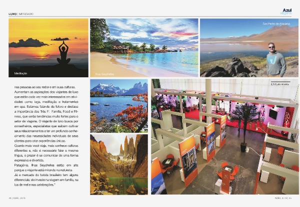 nas pessoas ao seu redor e em suas culturas. Aumentam as aspirações dos viajantes de luxo que estão cada vez mais interessados em atividades como ioga, meditação e tratamentos em spa. Estamos falando do futuro e destaco a importância dos Três F: Família, Food e Fitness, que serão tendências muito fortes para o setor de viagens. O viajante de luxo busca por conselheiros, especialistas que saibam cultivar seus relacionamentos e ter um profundo conhecimento das necessidades individuais de seus clientes para criar experiências únicas. Quanto mais você viaja, mais conhece culturas diferentes e, não é necessário falar a mesma língua, o prazer é se comunicar de uma forma expressiva e divertida. Patagônia, Ilhas Seychelles estão em alta porque o viajante está mirando na natureza. Já o mercado do turista brasileiro tem alguns diferenciais: ele investe na viagem em família, na lua de mel e nas celebrações.”