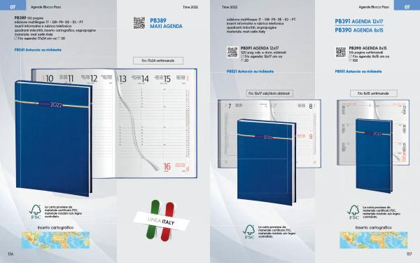 PB389 132 pagine edizione multilingue : IT - GB- FR- DE - ES - PT inserti informativi e rubrica telefonica quadranti imbottiti , inserto cartografico , segnapagine materiale : mat satin italy f . to agenda : 17x24 cm ca 30