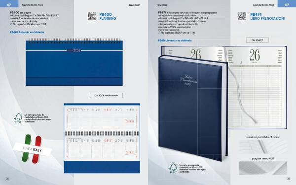 PB400 128 pagine edizione multilingue : IT - GB- FR- DE - ES - PT inserti informativi e rubrica telefonica materiale : mat satin italy f . to agenda : 30x14 cm ca 20
