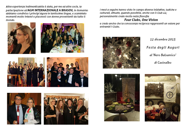Altra esperienza indimenticabile รจ stata, per me ed altre socie, la partecipazione all'AGM Internazionale a Brasov, in Romania: abbiamo condiviso i principi Agora in tantissime lingue, e scambiato momenti molto intensi e piacevoli con donne provenienti da tutto il mondo.