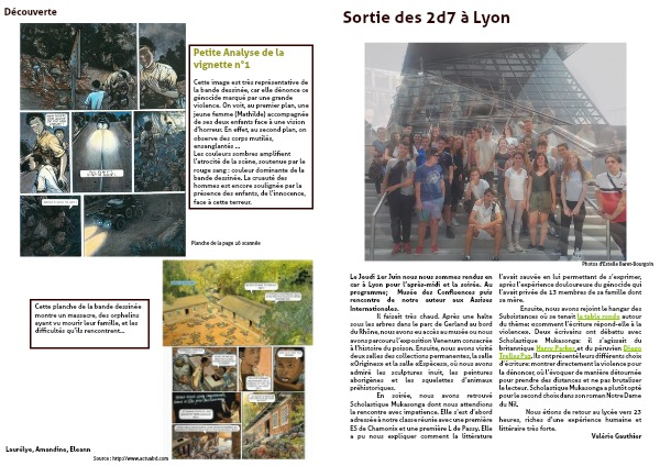 Cette image est très représentative de la bande dessinée, car elle dénonce ce génocide marqué par une grande violence. On voit, au premier plan, une jeune femme (Mathilde) accompagnée de ses deux enfants face à une vision d’horreur. En effet, au second plan, on observe des corps mutilés, ensanglantés …
