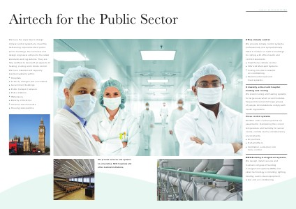 We have the expertise to design climate control systems to meet the demanding requirements of public sector buildings. Our technical and design engineers adhere to the latest standards and regulations. They are fully certified to deal with all aspects of heating, cooling and climate control. We have installed and regularly maintain systems within: l Hospitals l Schools, colleges and universities l Government buildings l Public transport network l Police stations l HM prisons l Ministry of Defence l Libraries and museums l Housing associations
