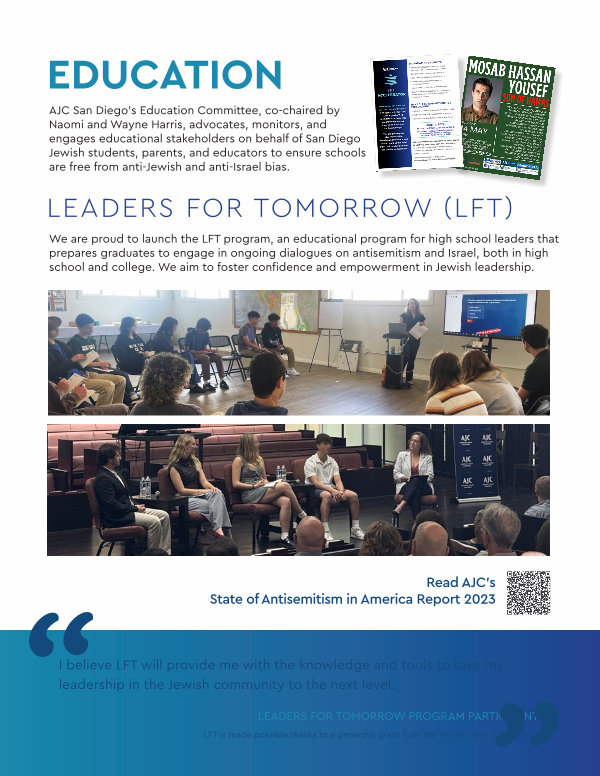 AJC San Diego’ s Education Committee, co-chaired by Naomi and Wayne Harris, advocates, monitors, and engages educational stakeholders on behalf of San Diego Jewish students, parents, and educators to ensure schools are free from anti-Jewish and anti-Israel bias.