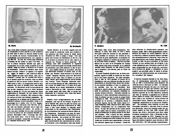 1960 frente a Tahl: y la preparación para la recuperación del trono le impedía tener más amplia actividad. En Botvinnick se dá la coincidencia de que en dos ocasiones retuvo su título haciendo valer la ventaja de 1 / 2 pto. que daban los viejos reglamentos al Campeón, de esa manera frente a Bronstein 1951 y a Smislov 1954, ambos en Moscú. mantuvo el cetro tras finalizar empatados. De los jugadores de la década del 30 hasta la del 70 solamente poseen record favorables frente a él, Barendregt( G-1), Geller( G-3 T-5 p, 1). Bogatyrchuck( G-3 T, 2) y Petrosian( G-6 T-20 P-3). sin dudas toda una hazaña, pensando que él jugó con todas las luminarias del tablero. Es curioso senalar que gran cantidad de sus más promisorios triunfos los obtuvo sin ser Campeón Mundial, por ejemplo, Nottinghan 1936 y Groninga diez años más tarde entre otros. Con el título. su nlE.jor victoria la consiguió, compartida con Smislov, en el 1 Alekhine Memorial en 1956.