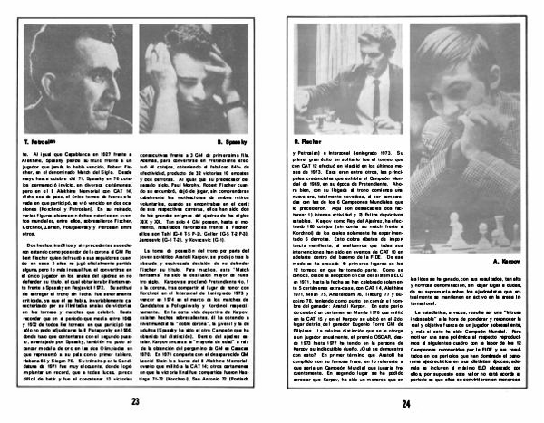 y Petrosian) e lnterzonal Leningrado 1973. Su primer gran éxito en solitario fue el torneo que con CAT 12 efectuó en Madrid en los últimos meses de 1973. Esos eran entre otros, las principales credenciales que exhibía el Campeón Mundial de 1969, en su época de Pretendiente. Ahora bien, con su llegada al trono comienza UIÍa nueva era, totalmente novedosa, al ser comparadas con las de los 6 Campeones Mundiales que lo precedieron. Aquí son destacables dos factores: 1) intensa actividad y 2) Exi tos deportivos estables. Karpov como Rey del Ajedrez, ha efectuado 180 cotejos( sin contar su match frente a Korchnoi) de los cuales solamente ha experimentado 6 derrotas. Esto cobra ribetes de importancia manifiesta. si analizamos que todas sus intervenciones han sido en eventos de CAT 10 en adelante dentro del baremo de la FI DE. De ese modo se ha anexado 10 primeros lugares en los
