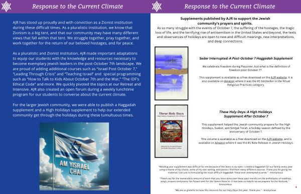 As a pluralistic and Zionist institution , AJR made important adaptations to equip our students with the knowledge and resources necessary to become exemplary Jewish leaders in the post-October 7th landscape . We are proud of adding additional courses such as “ Israel Post October 7 ,” “ Leading Through Crisis ” and “ Teaching Israel ” and special programming such as “ How to Talk to Kids About October 7th and the War ,” “ The IDF ’ s Ethical Code ” and more . We quickly pivoted the topics at our Retreat and Intensive . AJR also created an open forum during a weekly lunchtime program for our students to converse about the current climate .