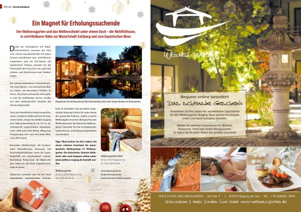 Tipp: Überraschen Sie Ihre Lieben mit einem schönen Gutschein für unvergessliche Wellnesstage im Wellnessgarten. Die Gutscheine können telefonisch oder auch bequem online unter: Wellnessgarten-Hotel www. wellness-waging. de bestellt werden. Tel. + 49( 0) 8681 / 478 480