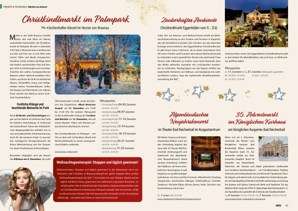 Wenn sich am 2. Adventwochenende die Pforten vom Königlichen Kurhaus Bad Reichenhall öffnen, erwartet die Besucher beim 35. Adventmarkt wieder ein faszinierendes Angebot. Rund 60 Aussteller aus Deutschland, Österreich, der Schweiz und Italien präsentieren traditionelle und moderne Handwerkskunst – von Porzellanmalerei, Töpferei, Schmuck und Schnitzarbeiten bis zu Patchwork, Papierkunst, Floristik, Krippen und vielem mehr. Zur musikalischen Untermalung spielen am Samstag Marina Plereiter mit Harfe und Gesang, am Sonntag Eva Kastner und Sabine Schmid mit Harfe und Hackbrett. Für das leibliche Wohl sorgt der GTEV D’ Saalachtaler Bad Reichenhall e. V., die Hausdekoration gestaltet die Gärtnerei der Staatsbad GmbH. Sa., 6. Dezember, 11:00 bis 17:00 Uhr / So., 7. Dezember, 10:00 bis 17:00 Uhr www. staatsbad-bad-reichenhall. de / adventmarkt