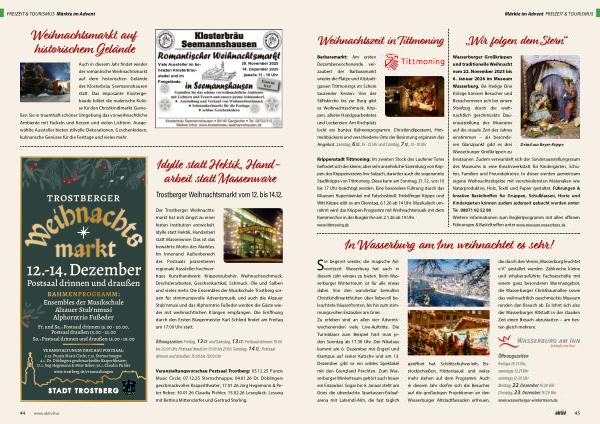 Krippenstadt Tittmoning: Im zweiten Stock des Laufener Tores befindet sich die kleine, aber sehr ansehnliche Sammlung von Krippen des Krippenvereins Inn-Salzach, darunter auch die sogenannte Stadtkrippe von Tittmoning. Diese kann am Sonntag, 21.12., von 10 bis 17 Uhr besichtigt werden. Eine besondere Führung durch das Museum Rupertiwinkel mit Fatschnkindl, Fridolfinger Krippe und Witt Krippe gibt es am Dienstag, 6.1.26 ab 14 Uhr. Musikalisch umrahmt wird das Krippen-Programm mit Weihnachtsmusik mit dem Kammerchor in der Burgkirche am 2.1.26 ab 19 Uhr. www. tittmoning. de