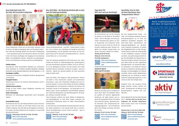 Unter dem Motto „ Früh beginnen, spät spezialisieren“ fördern wir Kinder in ihrer motorischen, sozialen und koordinativen Entwicklung – ganz ohne frühzeitige Festlegung auf eine bestimmte Sportart. In unserer KiSS erleben die Kinder vielfältige Bewegungsformen und Sportarten, entdecken ihre Talente und entwickeln Freude an der Bewegung – die beste Basis für ein aktives Leben. Unsere qualifizierten Sportlehrkräfte gestalten den Unterricht altersgerecht und abwechslungsreich. Die Gruppen umfassen maximal 15 Kinder. Unser Programm umfasst eine breite Palette an Bewegungsund Sportangeboten. Je nach Alter, Gruppe, Jahreszeit und individueller Entwicklung setzen wir dabei unterschiedliche Schwerpunkte. Je nach Interesse und individueller Entwicklung können die Kinder später problemlos in die nächste Stufe oder in verschiedenen Sportabteilungen unseres Vereins wechseln – ganz in ihrem eigenen Tempo. Mittwoch, 14:30-15:15 Uhr, TSV Halle Weitere Infos und Anmeldung: www. tsv-muehldorf. de / kiss /