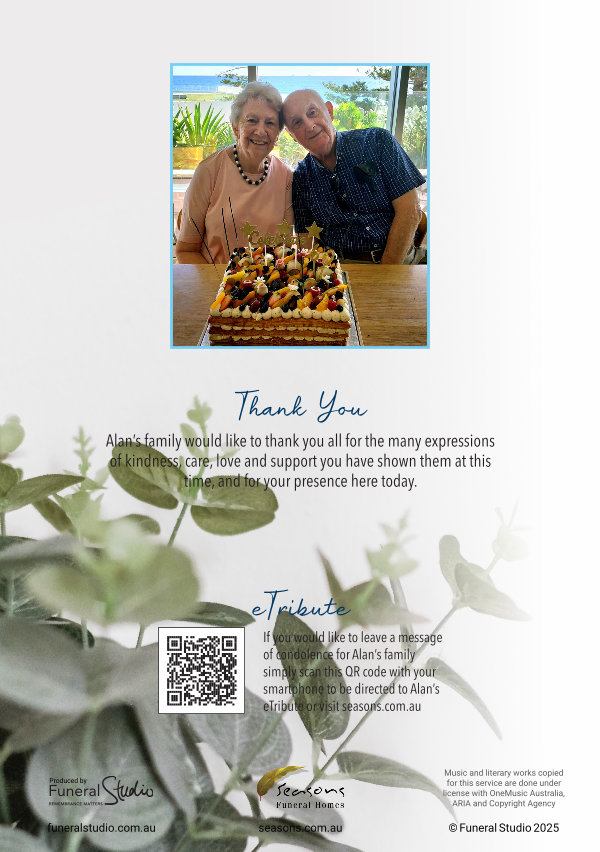 If you would like to leave a message of condolence for Alan’ s family simply scan this QR code with your smartphone to be directed to Alan’ s eTribute or visit seasons. com. au