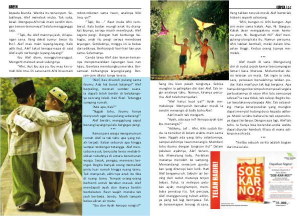 kepada ibunda. Wanita itu tersenyum. Sebaliknya, Alef menekuk muka. Tak suka, kesal. Mengapa Afni tak main sendiri dengan teman-temannya? Selalu mengganggu saja.