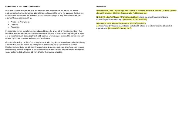 In relation to alcohol dependency to be compliant with treatment for the abuse, the person undergoing the treatment must be able to follow professional help and the guidance that is given to them to help overcome the addiction, such as support groups to help them understand the nature of their addiction such as: