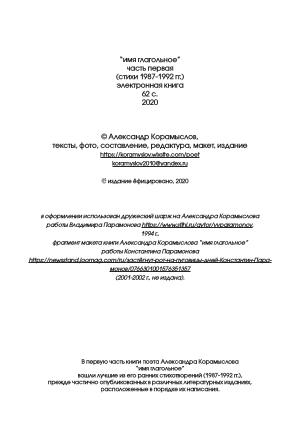 В первую часть книги поэта Александра Корамыслова “ имя глагольное ” вошли лучшие из его ранних стихотворений ( 1987-1992 гг .), прежде частично опубликованных в различных литературных изданиях , расположенные в порядке их написания .