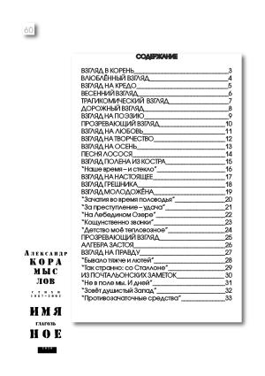 ВЗГЛЯД В КОРЕНЬ ______________________________ 3 ВЛЮБЛЁННЫЙ ВЗГЛЯД _________________________ 4 ВЗГЛЯД НА КРЕДО _____________________________ 5 ВЕСЕННИЙ ВЗГЛЯД _____________________________ 6 ТРАГИКОМИЧЕСКИЙ ВЗГЛЯД ___________________ 7 ДОРОЖНЫЙ ВЗГЛЯД ___________________________ 8 ВЗГЛЯД НА ПОЭЗИЮ ___________________________ 9 ПРОЗРЕВАЮЩИЙ ВЗГЛЯД _____________________ 10 ВЗГЛЯД НА ЛЮБОВЬ __________________________ 11 ВЗГЛЯД НА ТВОРЧЕСТВО _______________________ 12 ВЗГЛЯД НА ОСЕНЬ ____________________________ 13 ПЕСНЯ ЛОСОСЯ ______________________________ 14 ВЗГЛЯД ПОЛЕНА ИЗ КОСТРА ___________________ 15 “ Наше время – и стекло ”______________________ 16 ВЗГЛЯД НА НАСТОЯЩЕЕ _______________________ 17 ВЗГЛЯД ГРЕШНИКА ____________________________ 18 ВЗГЛЯД МОЛОДОЖЁНА _______________________ 19 “ Зачатия во время половодья ”________________ 20 “ За преступление – удача ”___________________ 21 “ На Лебедином Озере ”______________________ 22 “ Кощунственно звонки ”_______________________ 23 “ Детство моё тепловозное ”__________________ 24 ПРОЗРЕВАЮЩИЙ ВЗГЛЯД _____________________ 25 АЛГЕБРА ЗАСТОЯ _____________________________ 26 ВЗГЛЯД НА ПРАВДУ ___________________________ 27 “ Бывало тяжче и лютей ”_______________________ 28 “ Так странно : со Сталлоне ”__________________ 29 ИЗ ПОЧТАЛЬОНСКИХ ЗАМЕТОК _______________ 30 “ Не в поле мы . И дней ”_______________________ 31 “ Зовёт душистый Запад ”______________________ 32 “ Противозачаточные средства ”______________ 33