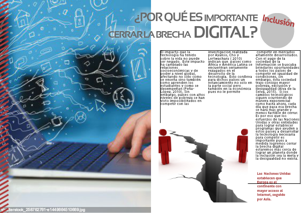 competir en mercados altamente desarrollados. Con el auge de la sociedad de la Información se buscaba brindarles oportunidades a todos los países de competir en igualdad de condiciones, sin embargo, ésta sociedad trajo consigo mayor pobreza, exclusión y desigualdad (Alva de la Selva, 2015). Si los cambios tecnológicos siguen ocurriendo de manera exponencial como hasta ahora, cada día que pasa esa brecha se hará más grande y menos factible de cerrar. Es por eso que los esfuerzos de las Naciones Unidas y otras entidades para lograr establecer programas que ayuden a estos países a desarrollar la tecnología necesaria para competir es importante pues a medida logremos cerrar la brecha digital estaremos más cerca de lograr un planeta donde la inclusión sea la meta y la desigualdad no exista.