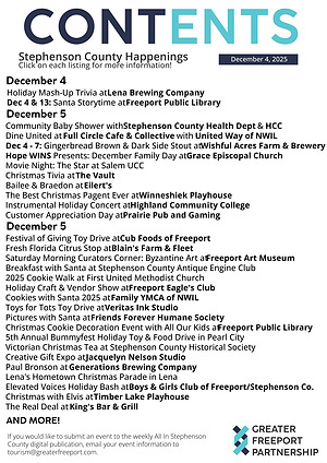 If you would like to submit an event to the weekly All In Stephenson County digital publication, email your event information to tourism@greaterfreeport.com.