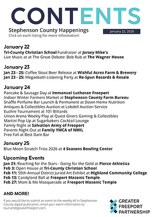 If you would like to submit an event to the weekly All In Stephenson County digital publication, email your event information to tourism@greaterfreeport.com.