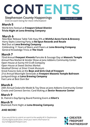 If you would like to submit an event to the weekly All In Stephenson County digital publication, email your event information to tourism@greaterfreeport.com.