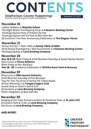If you would like to submit an event to the weekly All In Stephenson County digital publication, email your event information to tourism@greaterfreeport.com.