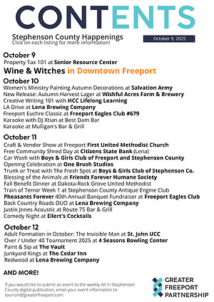 If you would like to submit an event to the weekly All In Stephenson County digital publication, email your event information to tourism@greaterfreeport.com.