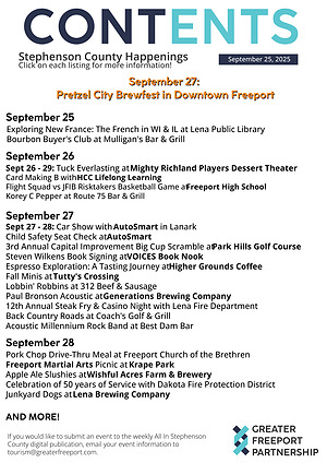 If you would like to submit an event to the weekly All In Stephenson County digital publication, email your event information to tourism@greaterfreeport.com.