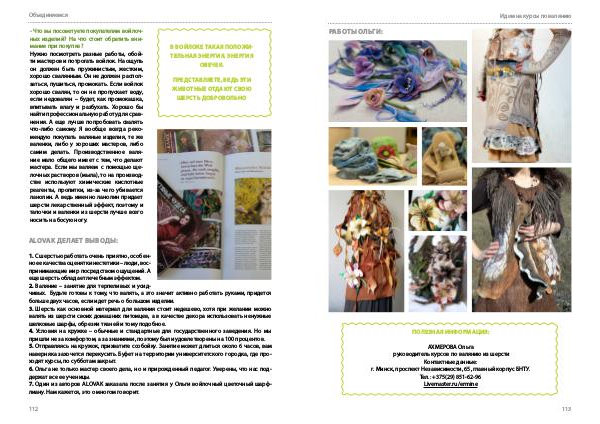 1. С шерстью работать очень приятно, особенно ее качества оценят кинестетики – люди, воспринимающие мир посредством ощущений. А еще шерсть обладает лечебным эффектом. 2. Валяние – занятие для терпеливых и усидчивых. Будьте готовы к тому, что валять, а это значит активно работать руками, придется больше двух часов, если идет речь о большом изделии. 3. Шерсть как основной материал для валяния стоит недешево, хотя при желании можно валять из шерсти своих домашних питомцев, а в качестве декора использовать ненужные шелковые шарфы, обрезки тканей и тому подобное. 4. Условия на кружке – обычные и стандартные для государственного заведения. Но мы пришли не за комфортом, а за знаниями, поэтому были удовлетворены на 100 процентов. 5. Отправляясь на кружок, прихватите ссобойку. Занятие может длиться около 6 часов, вам наверняка захочется перекусить. Буфет на территории университетского городка, где проходят курсы, по субботам закрыт. 6. Ольга не только мастер своего дела, но и прирожденный педагог. Уверены, что нас поддержат все ее ученицы. 7. Один из авторов ALOVAK заказала после занятия у Ольги войлочный цветочный шарфлиану. Нам кажется, это о многом говорит.