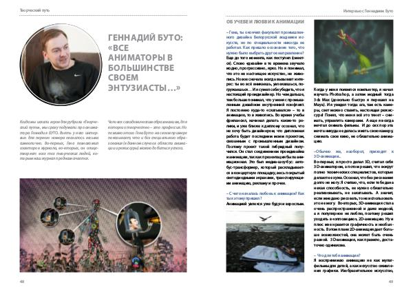 – Обычно же, наоборот, приходят к 3D-анимации... Во-первых, я просто делал 3D, считал себя 3D-аниматором, а потом решил, что вокруг полно технических специалистов, которые делают не хуже. Осознал, что без рисования долго не могу. Я считаю, что, если тебе дана некая способность, ее нужно обязательно реализовывать, не закапывать. А значит, если мне дано рисовать, то не использовать это не могу. Во-вторых, 3D-анимация стала очень распространенной и даже модной, а я популярное не люблю, поэтому решил уходить в « оппозицию », 2D-анимацию. Ну и плюс мне нравятся графичность и необычность. В этом плане 2D-анимация дает больше возможностей, она может быть очень разной. 3D-анимация, как правило, достаточно одинакова.